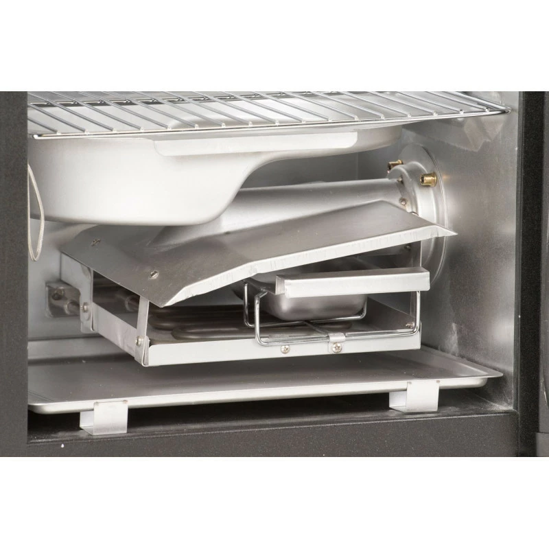 Abrir la puerta causa pérdida de calor y humo y alarga el tiempo de ahumar. Para minimizar la necesidad de acceder a la cámara de ahumado, el conveniente sistema de carga de astillas le permite acceder a la bandeja de astillas de madera desde el lado del ahumador, sin tener que abrir la puerta principal.
