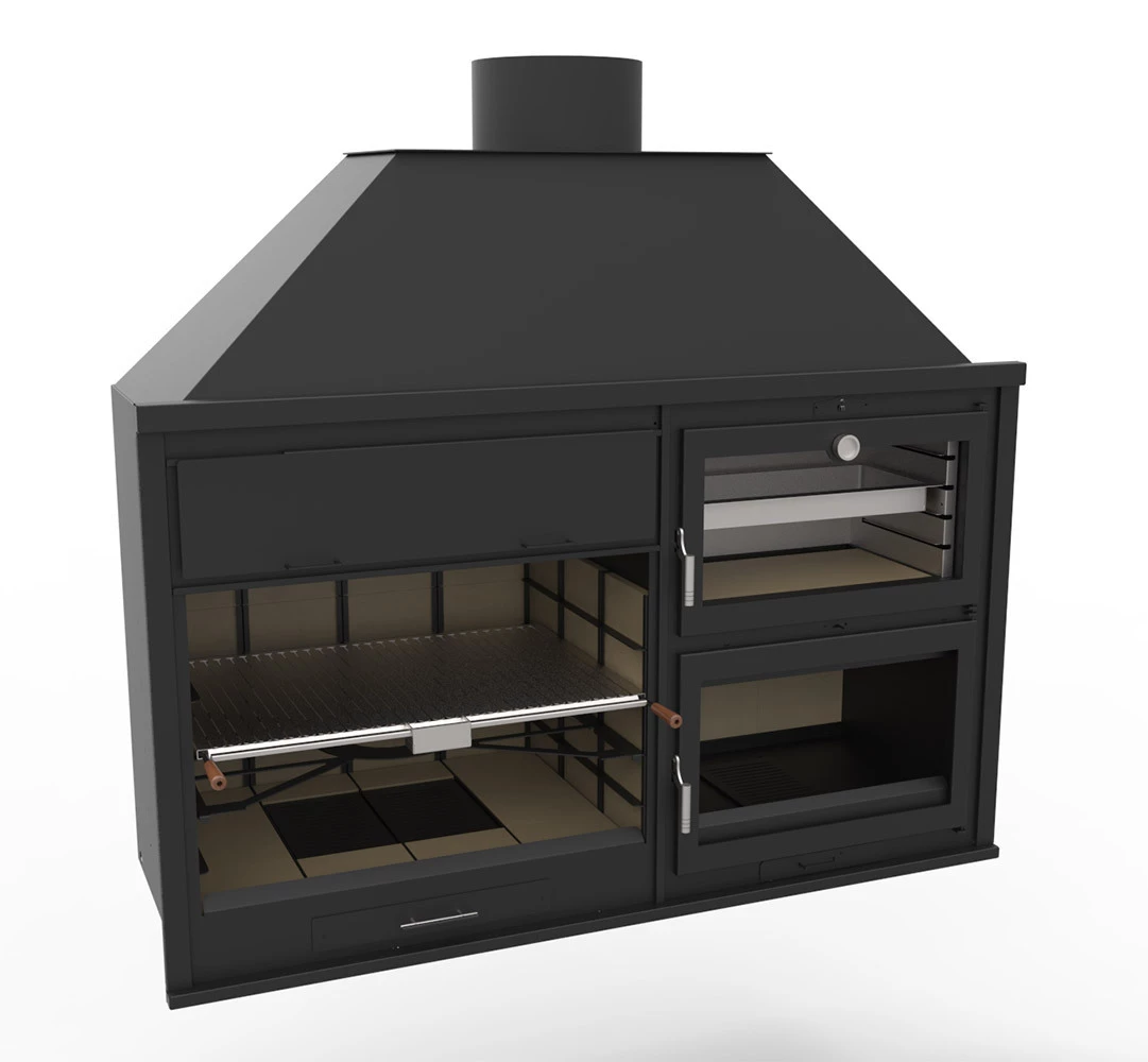 Incluye un termómetro incorporado para controlar la cocción de nuestros alimentos. La parrilla de la cámara de combustión es de fundición, el horno es desmontable y el sistema de limpieza es igual al de la barbacoa.