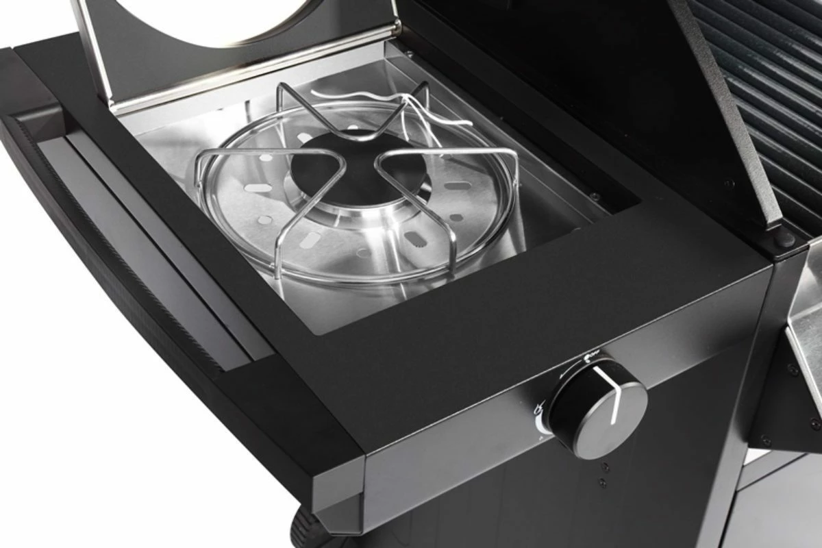 – 1 Quemador lateral con tapa integrado en la mesa lateral izquierda con encendido piezo electrónico.