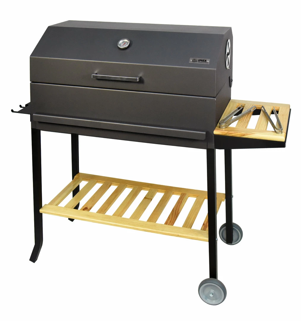 Las barbacoas de Imex El Zorro han sido completamente rediseñadas. Los cambios más relevantes a destacar son: Elegantes ruedas 4×4 para todo tipo de superficie, estante lateral reforzado de madera, tapa función horno con termómetro, cajón recoge cenizas reforzado, parrilla de hierro fundido, cuba fabricada en acero de alta resistencia lo que nos permite poder usar leña sin problema.