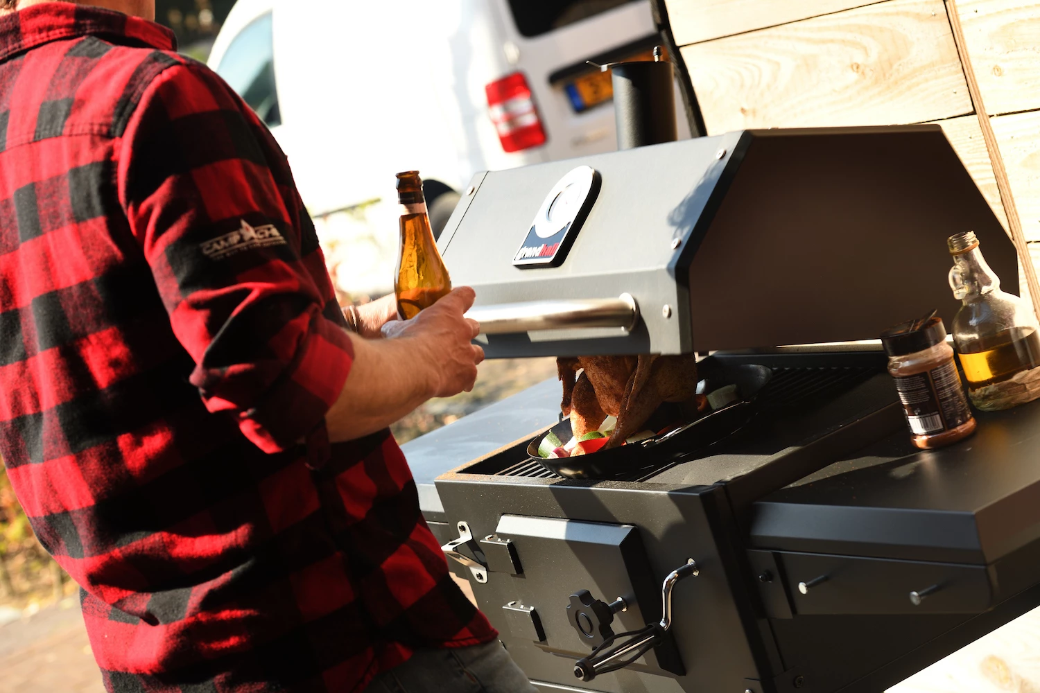 Esta barbacoa viene muy equipada de serie, incluyendo un práctico abridor para botellas, ganchos porta utensilios, una bandeja para las brasas que se puede ajustar en altura fácilmente con la manivela situada en la parte delantera de la barbacoa, termómetro integrado en la tapa y los estantes laterales son plegables lo que lo hacen perfecta para guardarla.