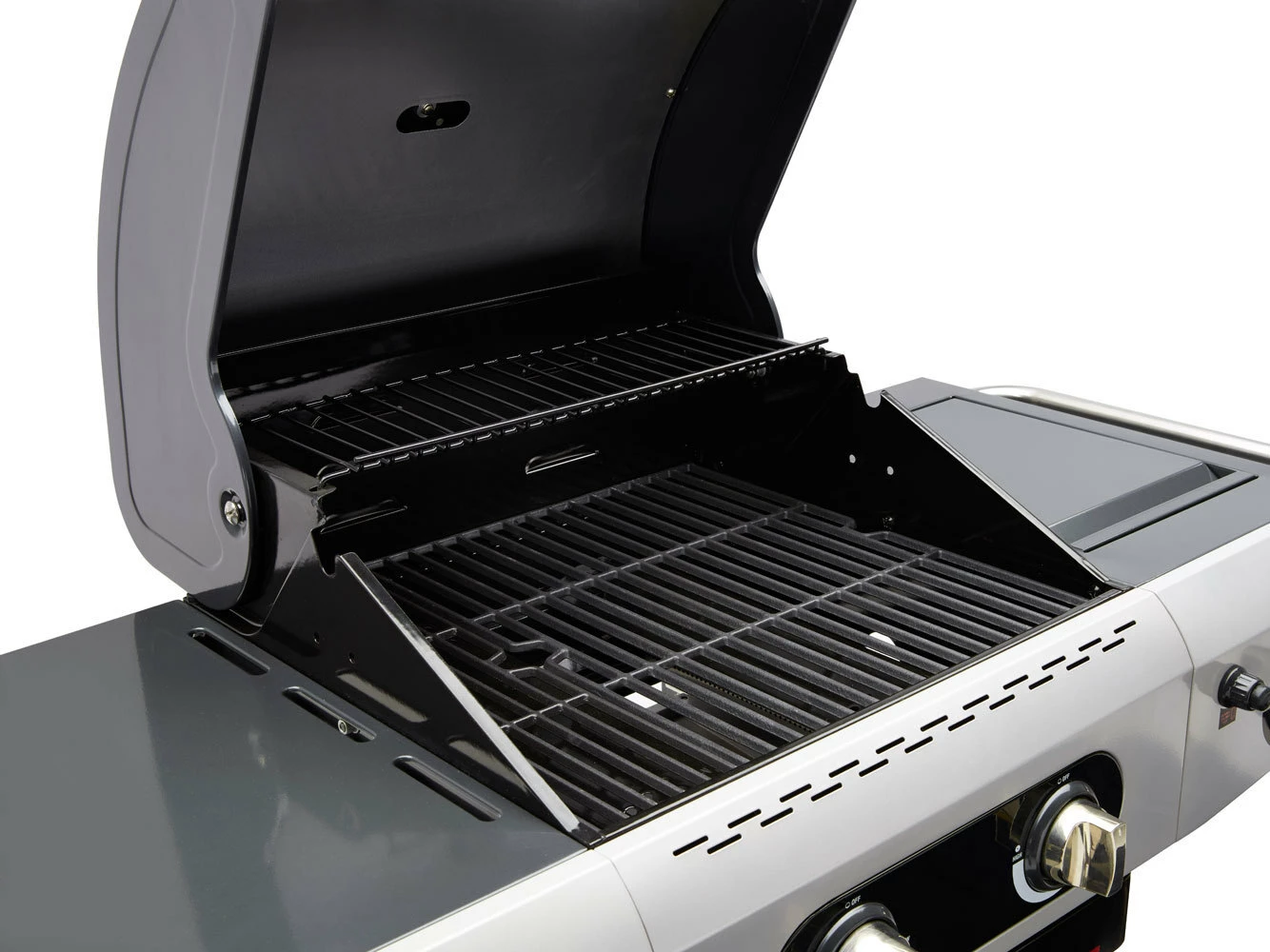 – La superficie de cocción se compone de 1 parrilla de hierro fundido de 35 x 43 cm. + 1 parrilla de hierro fundido de 13,5 x 43 cm.