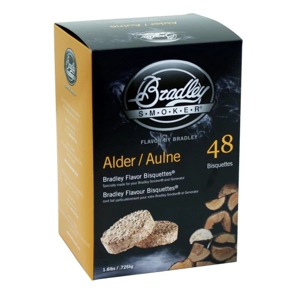 El Aliso ha sido la madera de ahumar preferida de los Europeos y los nativos Americnos durante miles de años. Dulce, rico y almizclado, los bisquettes de madera de Aliso de Bradley le dan un sabor suave de nuez a carnes blancas y a pescados. El sabor que nos da lo hace ideal para carne de cerdo, aves de corral, aves de caza y el salmón. Ligero, versátil y rico, perfecto con verduras, queso y todos los mariscos.