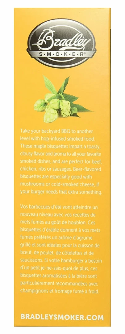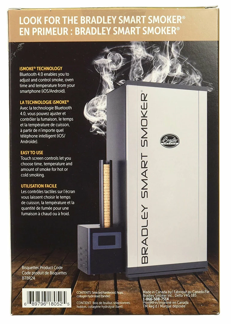 La clave del éxito de los ahumadores Bradley son los Bisquettes de sabores Bradley Prémium, la nueva línea de Bisquettes de Bradley, con especias y hierbas para realzar el sabor y el aroma de sus platos ahumados favoritos. Para producir los bisquettes, las virutas de madera están unidas entre sí usando la cantidad precisa, a presiones y densidades controladas. El sabor del humo se determina por la variedad de madera que se quema.