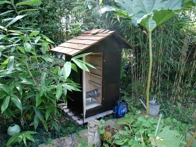 Una estructura ideal podría ser un una caseta de madera o metal, un viejo arcón congelador en posición vertical, la tapa se utilizaría como puerta, con un agujero de 11 cm. en un lateral para colocar el adaptador, y un orificio de ventilación en la parte superior con el fin de permitir un tiro natural que fluya a través de la estructura. Es importante hacer dicho agujero de ventilación para tener una buena calidad en el ahumado de los alimentos y para evitar también que el humo vuelva a entrar en el generador de humo.