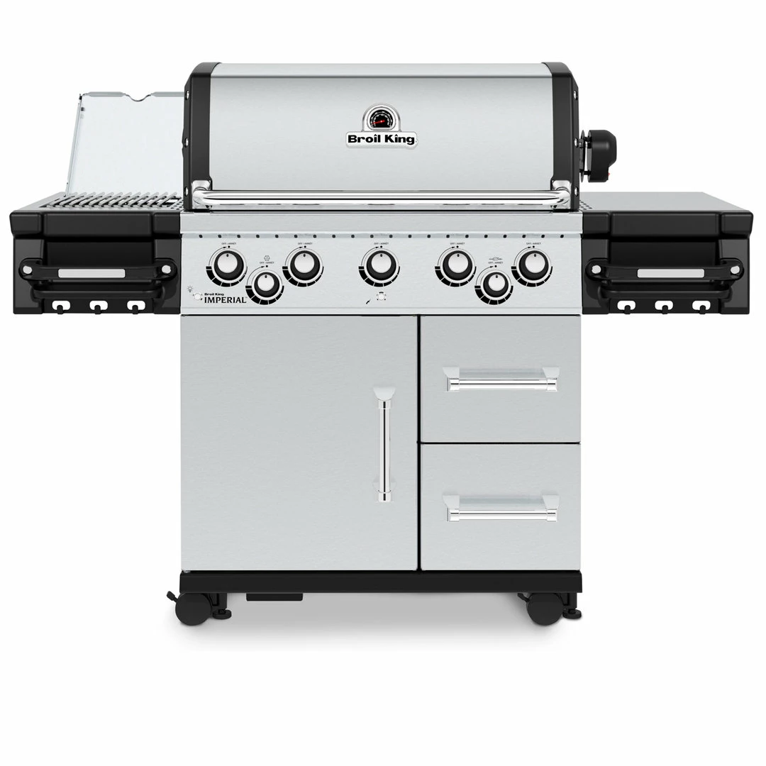 La barbacoa de gas Broil King Imperial 590 viene equipada con todo lo necesario para ayudarnos a ser el mejor Chef, Kit rustidor, cajones y puertas para almacenamiento, luces integradas en la tapa ideal para cocinar de noche, quemador lateral, quemador trasero, etc.