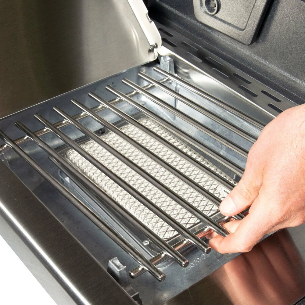 El quemador Infrarrojos lateral para barbacoas Broil King incluye una parrilla de Acero Inoxidable de 8 mm. de espesor y de un tamaño de 24,5 x 30,3 cm. de espacio para cocinar.