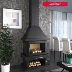 Chimenea de leña de rincón con interior en vermiculita. Diseño clásico con leñero , en el que se ha conseguido un gran aprovechamiento de su poder calorífico.