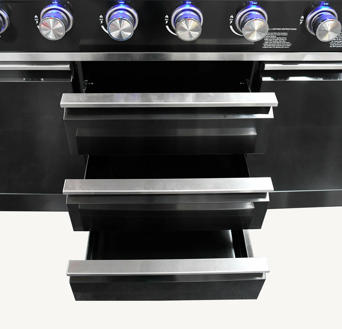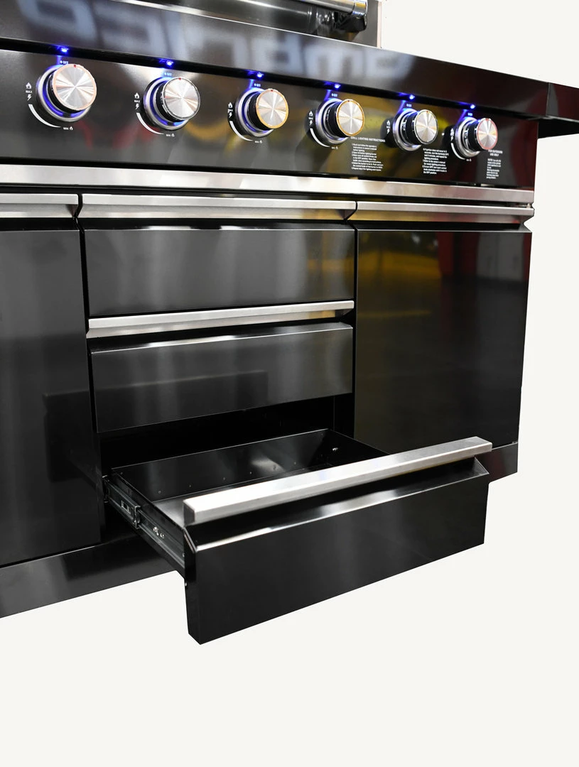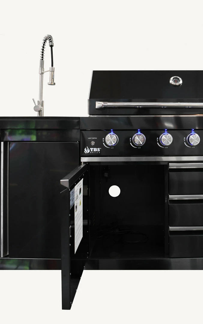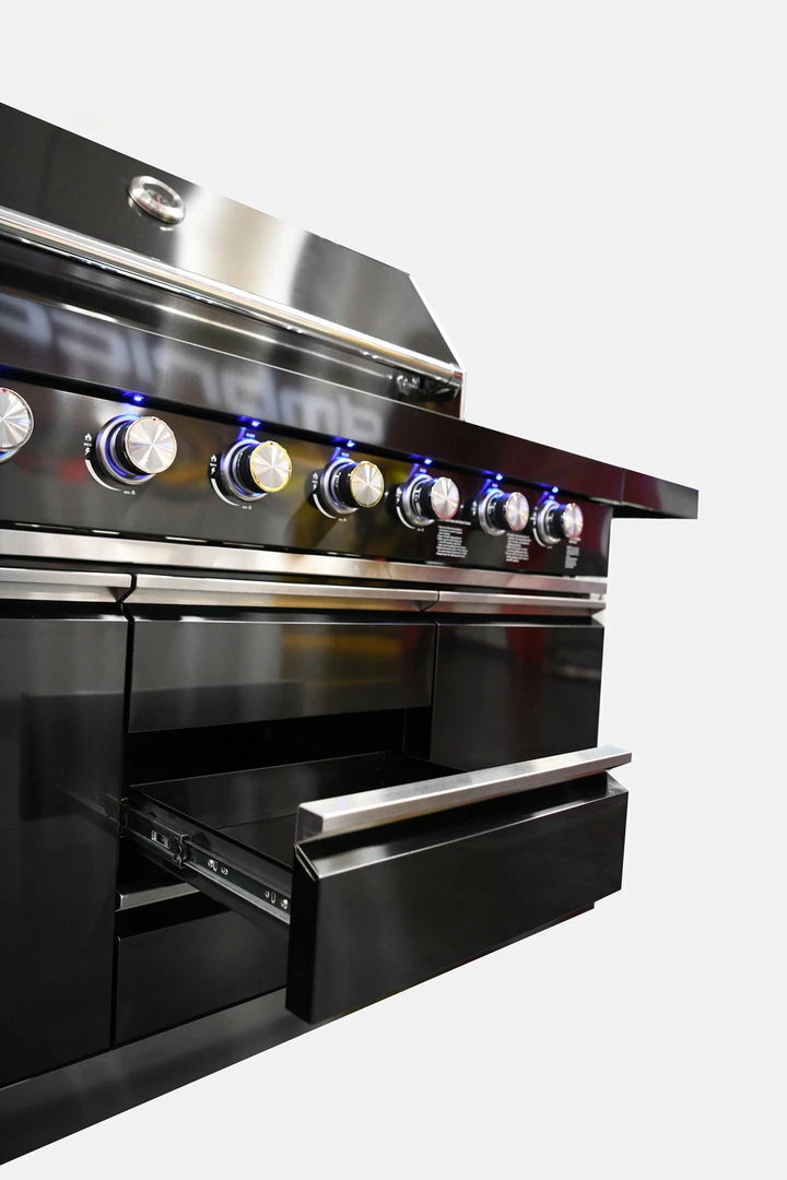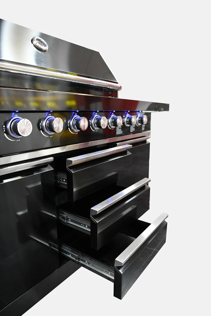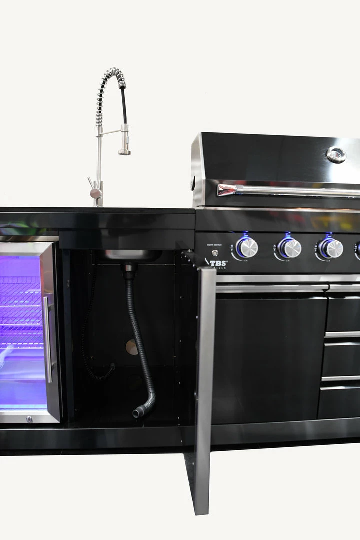 Convierta el arte del cocinado a la barbacoa en un proceso divertido e impresione a sus familiares y amigos gracias a esta maravilla de cocina de exterior de Acero Inoxidable modelo Marbella, con barbacoa de 6 quemadores, fregadero con grifo y nevera. Le ofrece una cocina de exterior enorme y elegante con todo lo que necesita, una barbacoa de gas integrada con 6 quemadores de Acero Inoxidable, un quemador lateral, un quemador infrarrojos trasero, una nevera, 3 cajones de almacenamiento, dos módulos de puertas, un fregadero con buen espacio de almacenamiento debajo y una funda para toda la unidad.