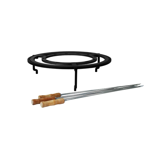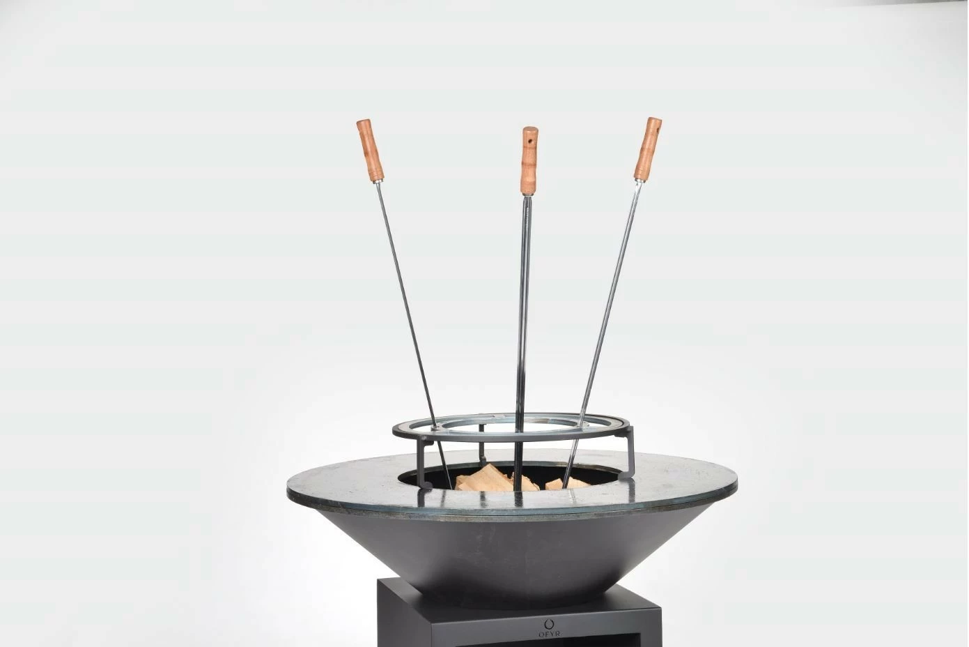 Convierta su Barbacoa de Leña Ofyr XL en una barbacoa de estilo brasileño con este juego de tres pinchos con un soporte circular de acero. Los pinchos tienen mangos de madera para un fácil manejo, y permiten cocinar a la perfección la carne directamente sobre el fuego.