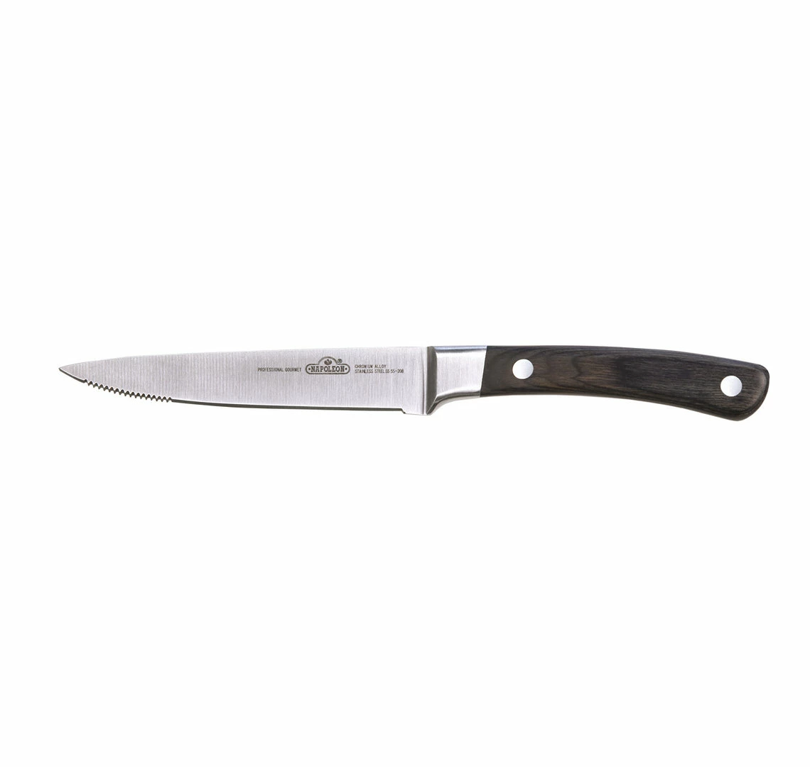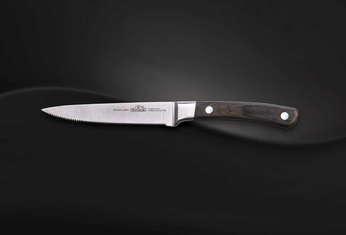 Los cuchillos para filete de palisandro y acero inoxidable de aproximadamente 12 centímetros de Napoleon hacen eso y mucho más. Con su pieza de acero inoxidable y la bella manija de palisandro que se adapta de forma cómoda y suave a su mano, ¿quién no querría cortar su filete todo el día?