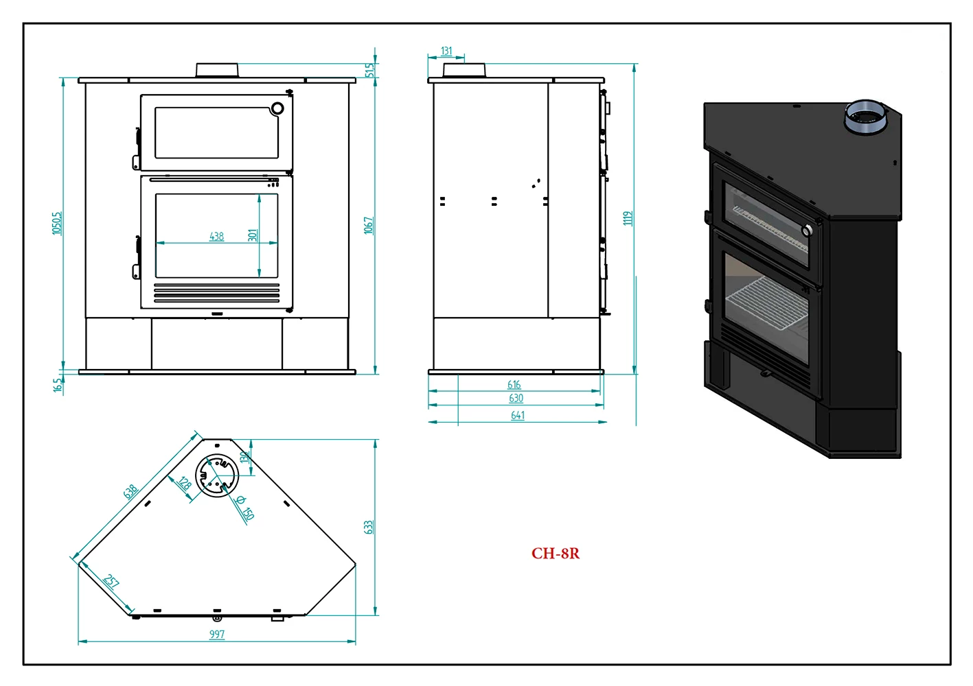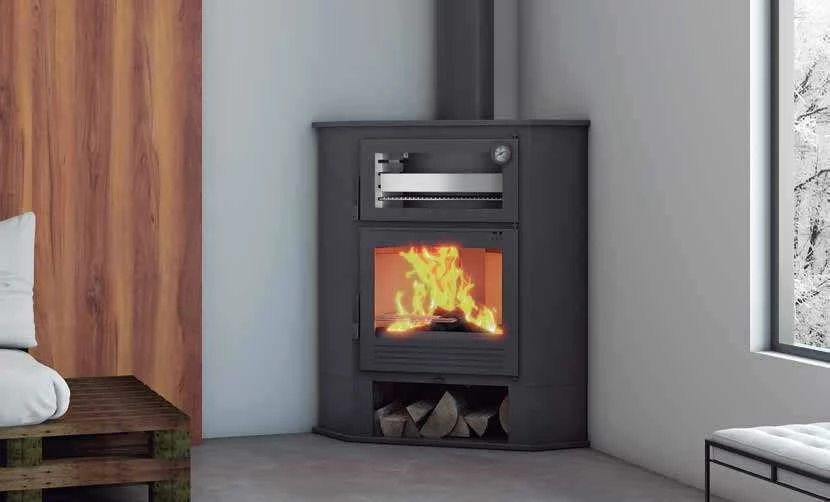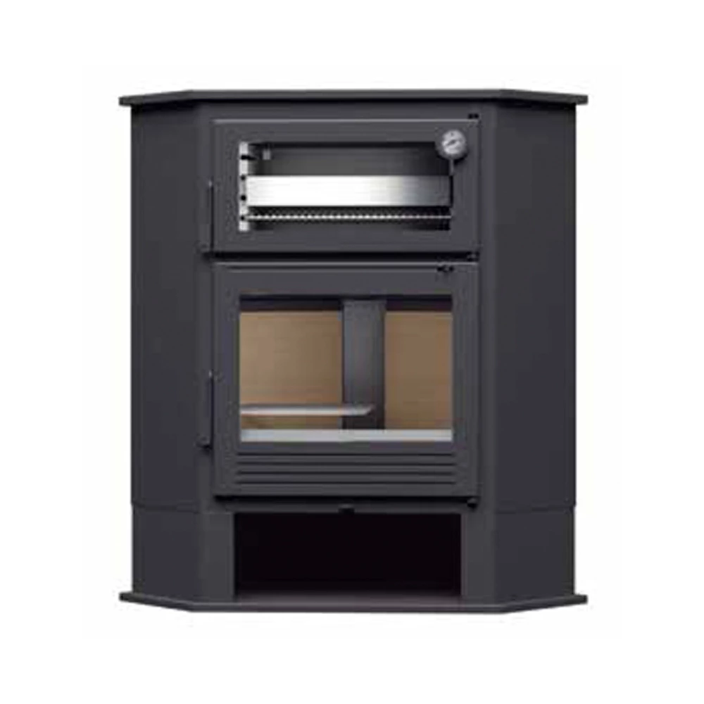 Estufa de Leña con Puertas y Parrilla de Fundición con volumen de calefacción de 313 m3. Incluye guante, parrilla asados giratoria Inoxidable 310 x 300 mm y bandeja acero inoxidable para Horno de 450 x 350 x 60 mm. Espesor 0,8 mm.