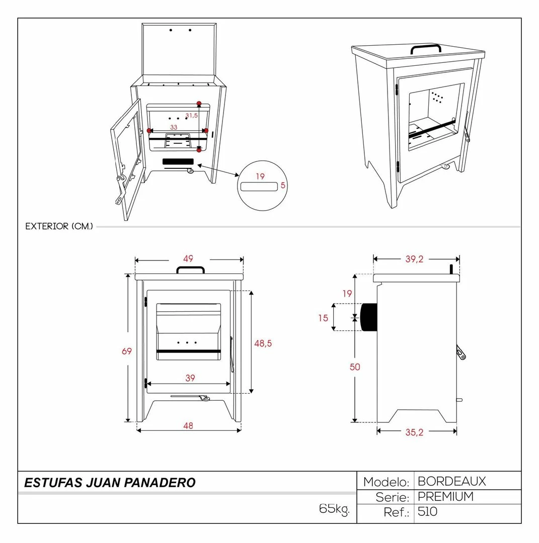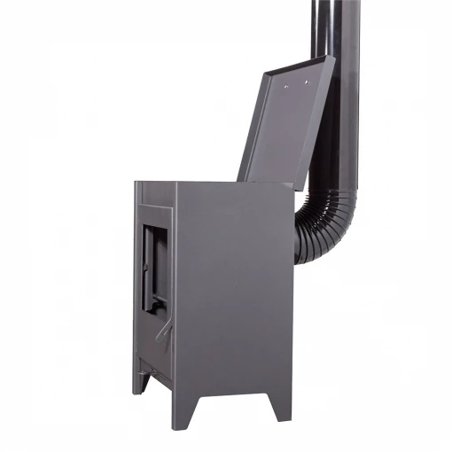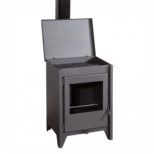 Estufa frontal de diseño muy actual fabricada en acero pintado en color gris oscuro. Puerta con cristal vitrocerámico. Leñero incorporado.