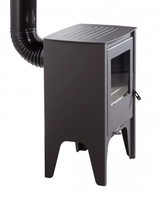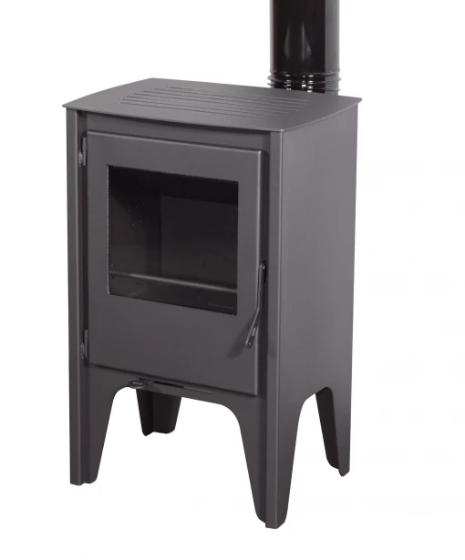 Estufa frontal de diseño muy actual fabricada en acero pintado en color gris oscuro. Puerta con cristal vitrocerámico. Leñero incorporado. Adaptada a la futura normativa europea Eco Design.