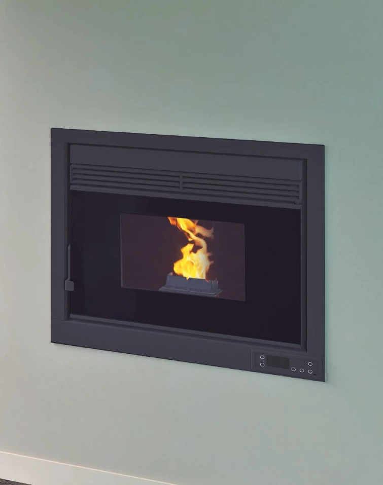 Estufa de Pellet con un 89 % – 95 % de eficiencia energética para 270 m3 de volumen calefactable. Volumen de la Tolva de 23 Litros. Mando a distancia y guantes incluidos.