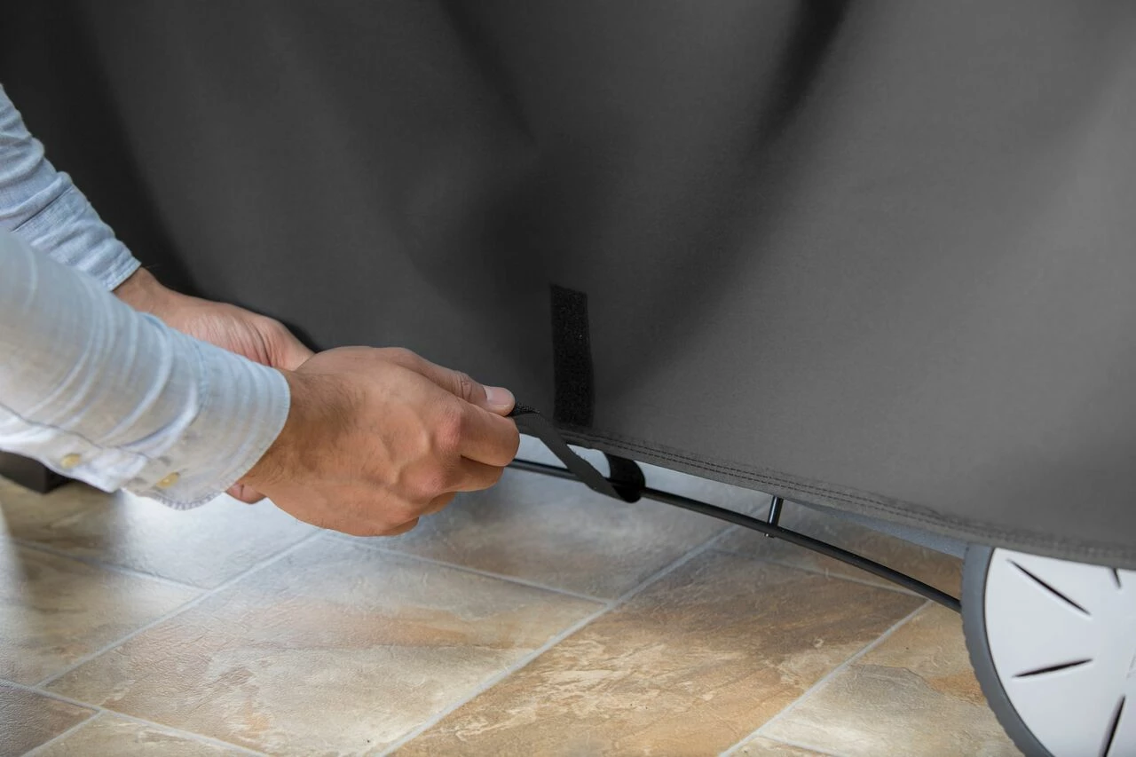 Hay dos correas de velcro, una en cada lado, que permiten sujetar la funda fuertemente, previniendo que salga volando cuando haya fuertes vientos. Otra pequeña tira de velcro mantiene la bolsa de almacenamiento atada a la funda para prevenir su pérdida.