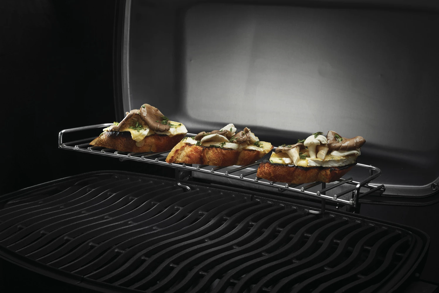 El innovador diseño de las bisagras de la rejilla para mantener el calor permite que las rejillas se puedan plegar cuando no están en uso, de esta manera se tiene acceso total a las parrillas de cocción principales. Es ideal para mantener calientes los platos o tener un área adicional de cocción.