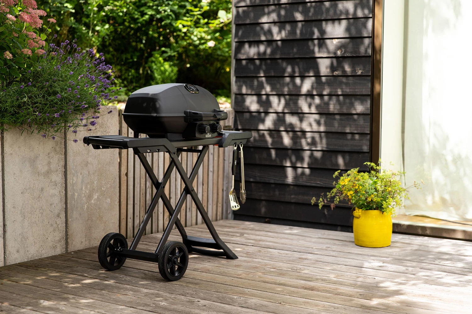 Su ligero carro plegable en negro mate posee ruedas todo terreno, es de montaje fácil, y cuenta con almacenamiento compacto y correas para el tanque de propano. La barbacoa portátil de gas propano Phantom TravelQ™ PRO285 en un especial negro mate tiene mucho más que un buen aspecto. Es todo un estilo de vida.
