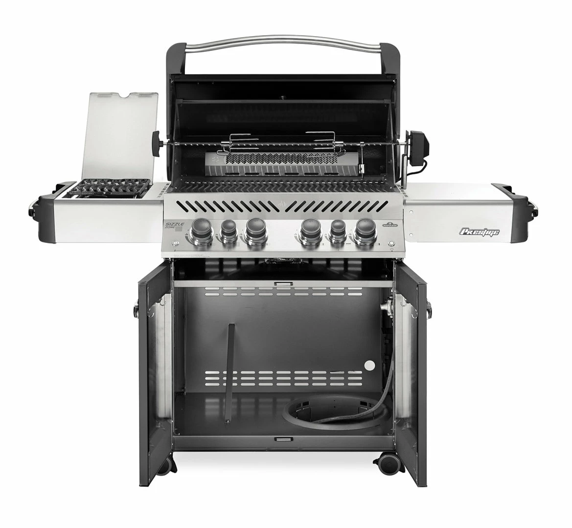 La barbacoa de gas Napoleon Prestige 500 es un modelo con carro que tiene todas las capacidades de una cocina exterior completa. El carro de porcelana esmaltada gris proporciona durabilidad contra los elementos de la intemperie, mientras que los detalles cromados añaden un toque de lujo.