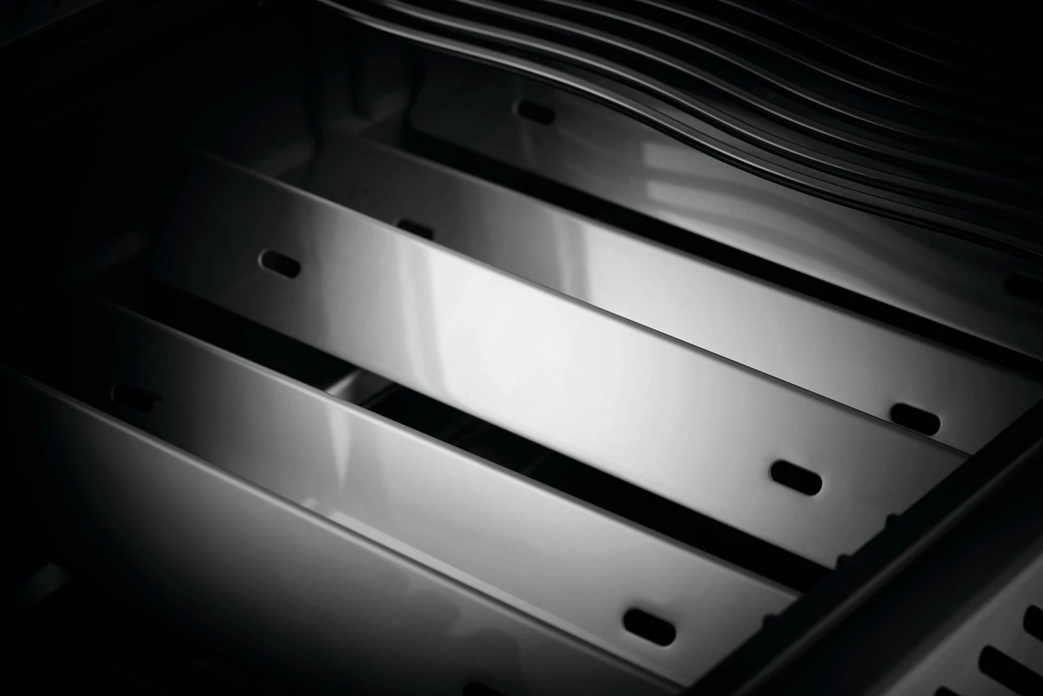 Debajo de los protectores de llama de la Napoleon Prestige Pro 500, encontrará los cuatro quemadores de Acero Inoxidable 304 de Napoleon. Cada uno de ellos se enciende mediante el fiable sistema de encendido Jetfire, para un encendido rápido y seguro.