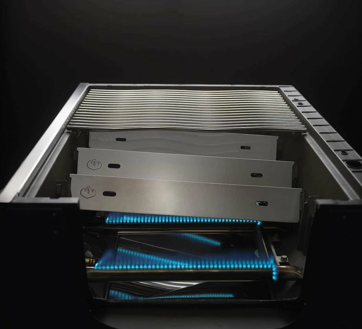 Debajo de los protectores de llama de la Napoleon Prestige Pro 665 Negra, encontrará los cinco quemadores de Acero Inoxidable 304 de Napoleon. Cada uno de ellos se enciende mediante el fiable sistema de encendido Jetfire, para un encendido rápido y seguro.