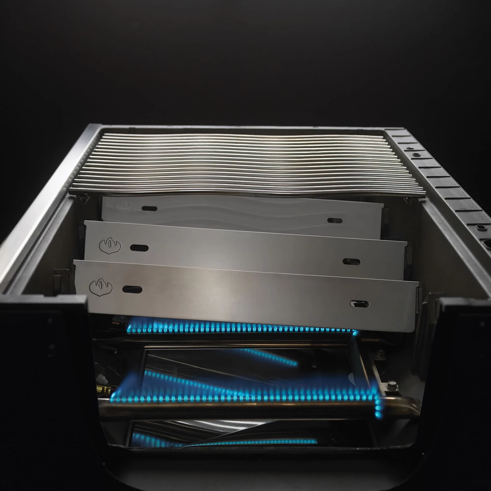La configuración escalonada crea una distribución uniforme del calor y protege los quemadores.
