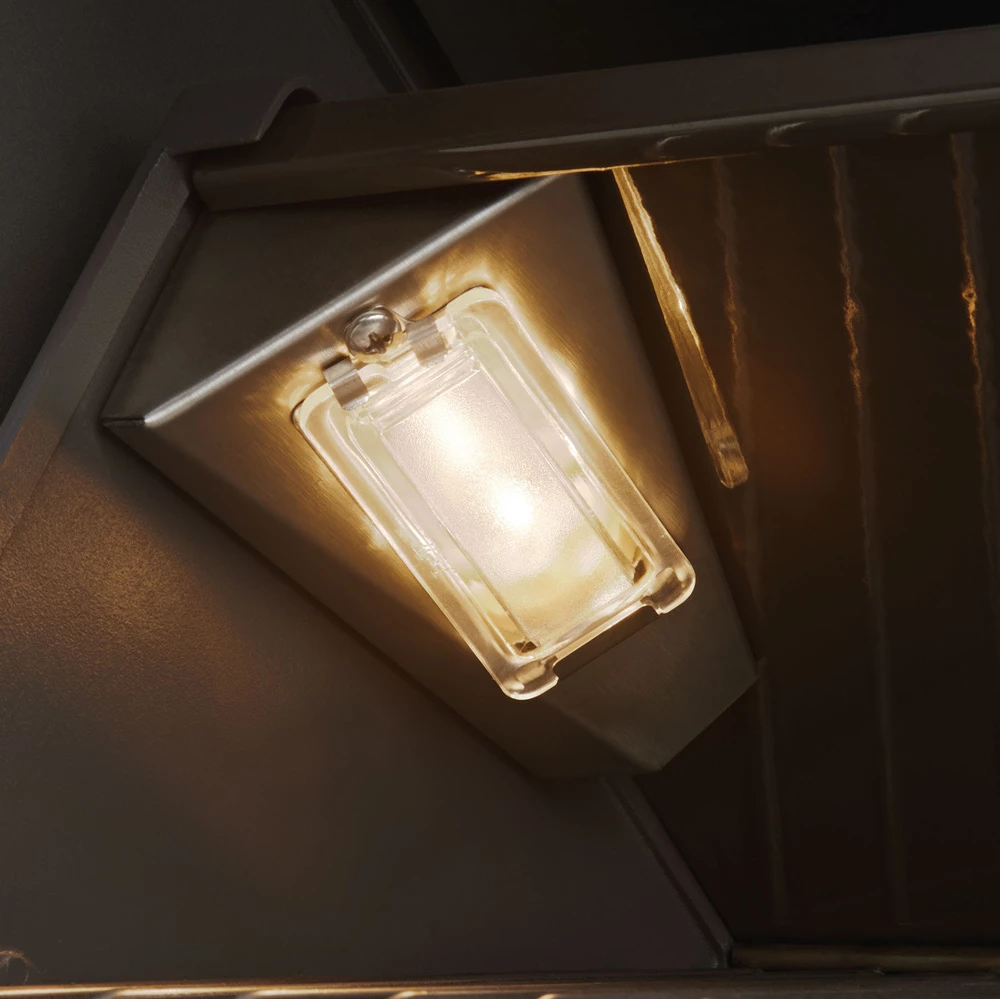 Las luces halógenas interiores iluminan la superficie de cocción para asar por la noche.