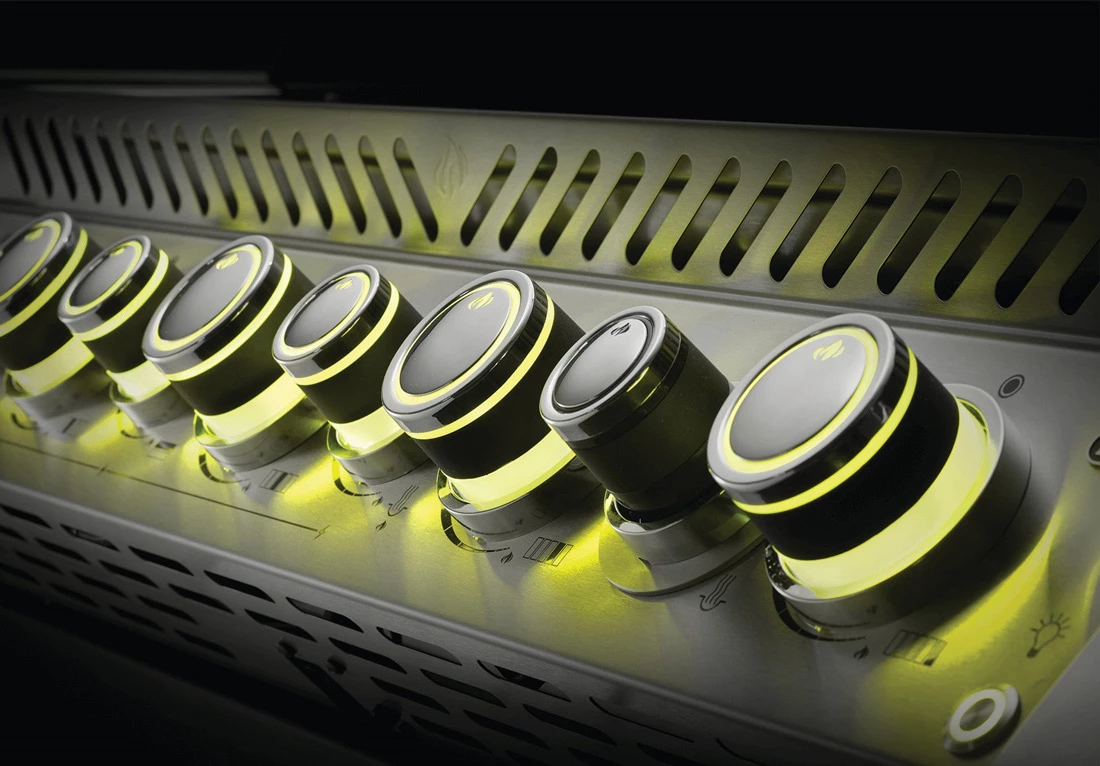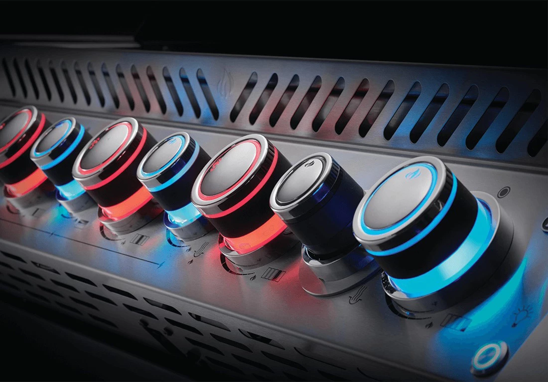 En todos los modos de color, los mandos de los quemadores que encienda brillarán en rojo. Esta característica de seguridad hace que sea fácil ver qué partes de la barbacoa están encendidas. Los mandos se pueden incluso configurar para que se enciendan automáticamente cuando se ajustan al modo de sensor de movimiento.