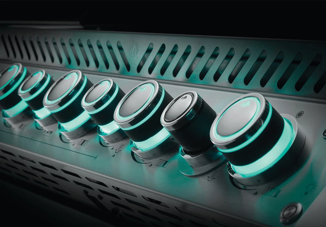 Los mandos iluminados con luz LED de esta barbacoa pueden ajustarse al color que desee. Cuando se ajusta al verde, los mandos comienzan a recorrer todos los colores. Es muy bonito poder dejar que pasen constantemente los colores, o que se detengan cuando lleguen al color en él que quieres que permanezcan. Incluso puedes ponerlos en el color de tu equipo favorito para el día del partido. La Napoleon Prestige Pro está hecha para ser llamativa.