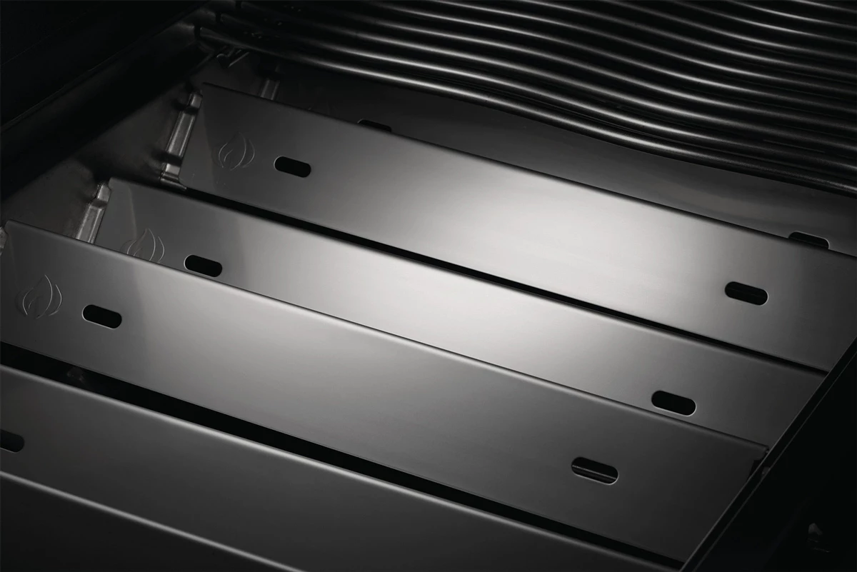 Los protectores de llama de Acero Inoxidable 304 de doble nivel de Napoleon proporcionan una gran cobertura para dispersar el calor uniformemente procedente de los quemadores inferiores. La forma de ^ de los protectores de llama hace que la grasa caiga rápidamente, evitando que se produzcan llamaradas. El diseño de doble nivel de los protectores de llama proporciona una protección adicional asegurando que los goteos se evaporen, incluso entre cada quemador. Cada protector de llama tiene un orificio, lo que facilita ver los quemadores que están encendidos, desde la superficie de la parrilla.