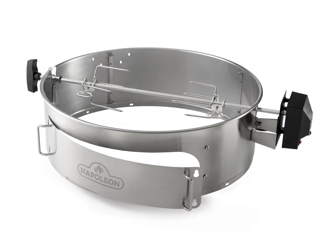 Prepara un pollo crujiente o una deliciosa pizza con este asador giratorio y horno para pizza especialmente diseñado para las barbacoas de carbón de 57 cm de Napoleon. Este accesorio amplía el espacio de cocción debajo de la cuba de la barbacoa y crea condiciones óptimas para una perfecta distribución del calor dentro del espacio de cocción.
