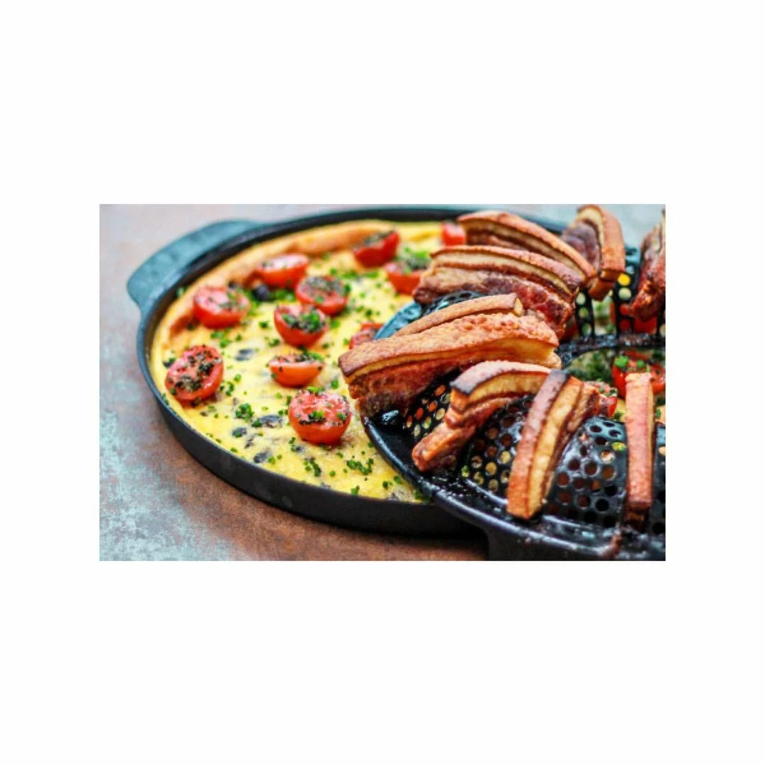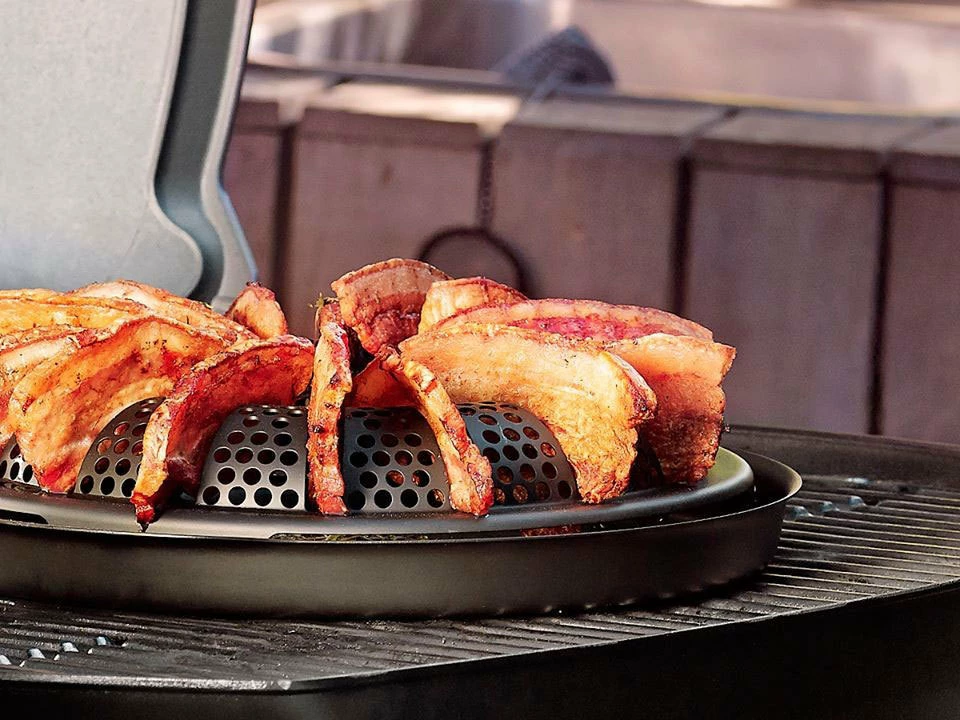 Este accesorio de la gama GBS de Weber, cuenta con una función 2 en 1, sirve para preparar tortillas o cocer masa de pizza con la sartén, además de la pieza principal para preparar hasta 16 tiras de panceta o bacon a la vez en la barbacoa.