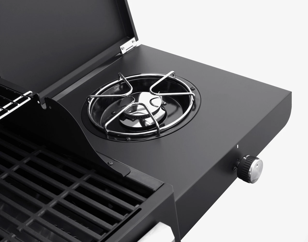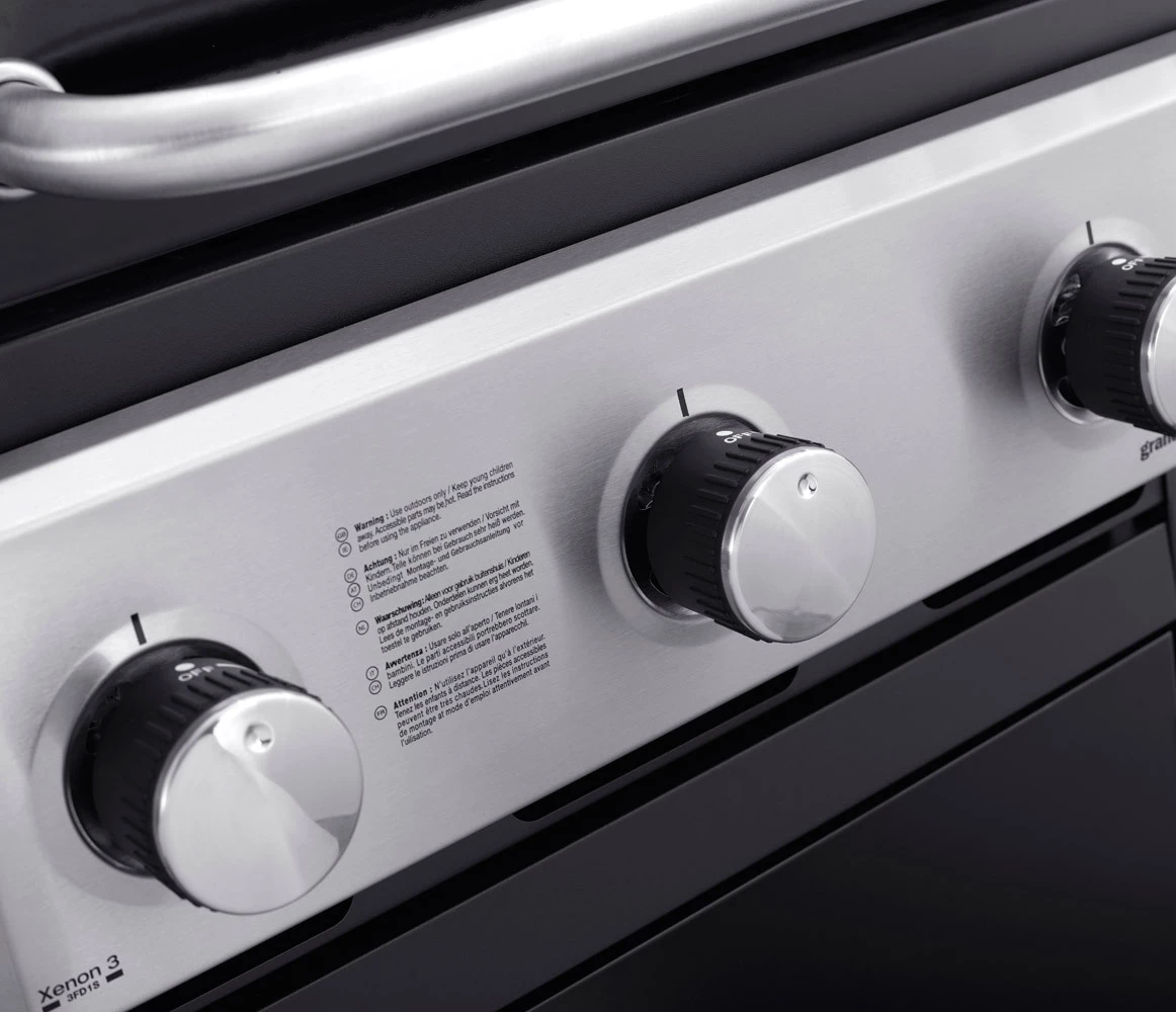 La barbacoa Grandhall Xenon 3 es perfecta para los amantes de la buena mesa y para los parrilleros más exigentes. Con su excelente construcción, diseño elegante, y buenísima relación calidad/precio, esta barbacoa nos quedara fantástica en cualquier zona de nuestra terraza o jardín. Con un solo toque de un botón, los quemadores se encienden y alcanzarán la temperatura de cocción en cuestión de minutos. Gracias al termómetro que integra en el tapa, usted podrá conseguir las temperaturas perfectas cuando utilice su barbacoa para función de horno para realizar asados, rustideras, pizzas, pescados al horno, etc. La mesa lateral izquierda es plegable, lo que hace que sea ideal para usar la barbacoa en espacios pequeños y también a la hora de guardarla.